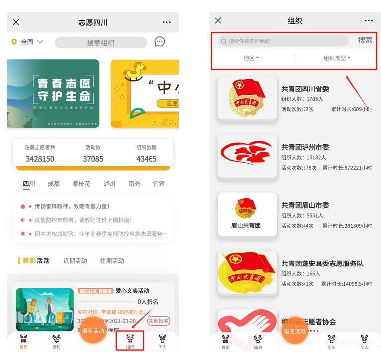 进入“志愿四川”平台色漫,点击下方组织,按照标准筛选或自己输入,找到组织。