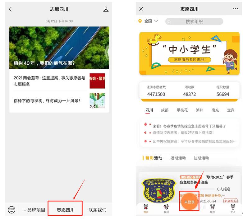 第二步:进入“天府新青年”或“志愿四川”公众号,点击左下方“志愿四川”进入平台色漫,点击下方“未登录”按钮。