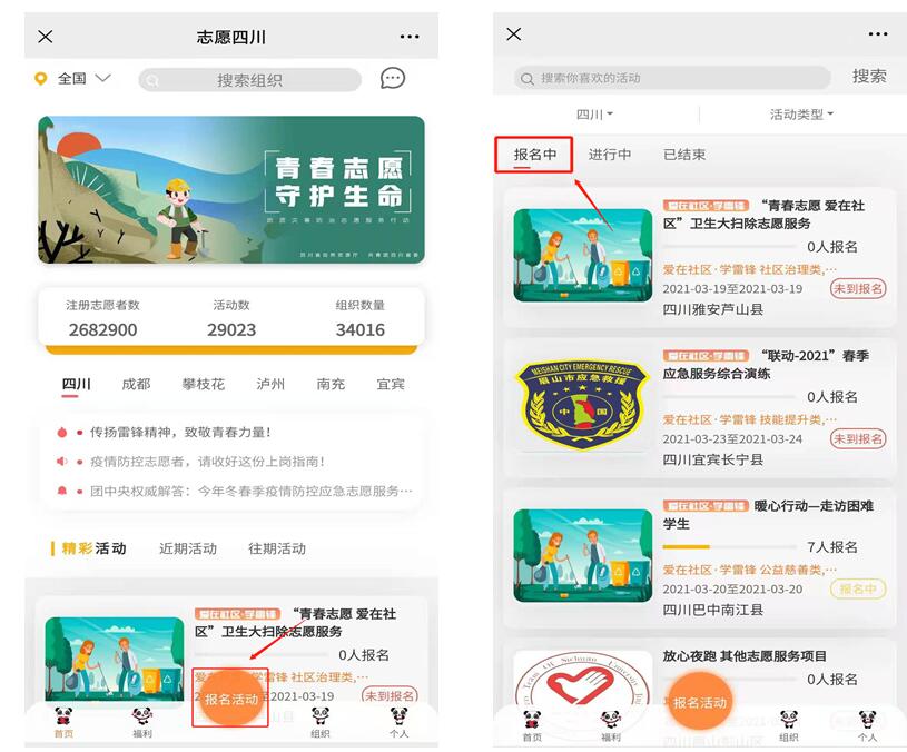 第一步:进入志愿四川平台色漫后,点击“报名活动”按钮。